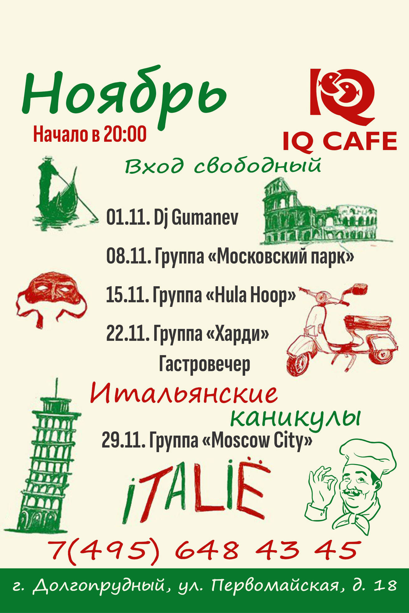 По субботам для Вас выступают приглашённые группы, которые играют в разных жанрах, следите за афишей!!!Несколько раз в месяц мы проводим тематические вечеринки с развлекательной программой и призами)